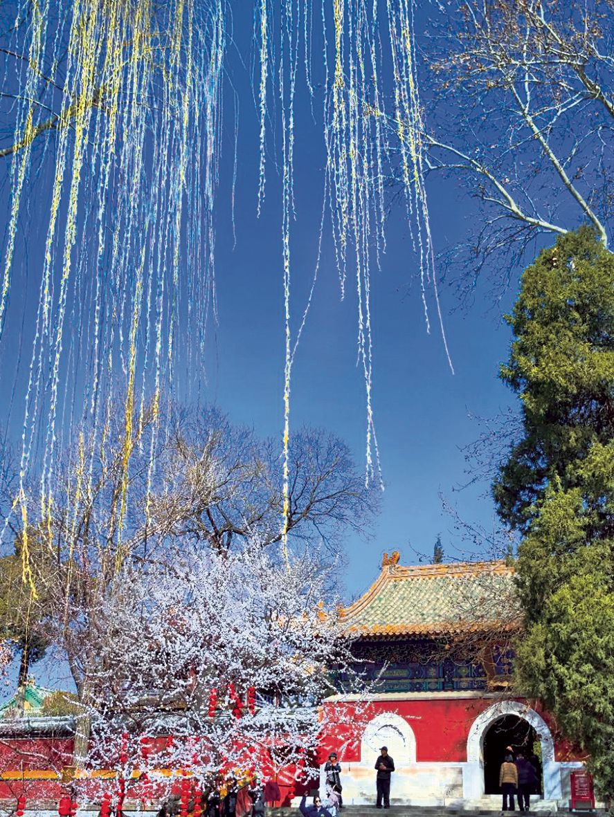 走到湖边,丝丝柳条悄然入镜。这青绿的丝绦挂在湛湛蓝天中,与淡粉色的桃霞、古寺的红墙碧瓦,勾勒出太液池旁大美春华。