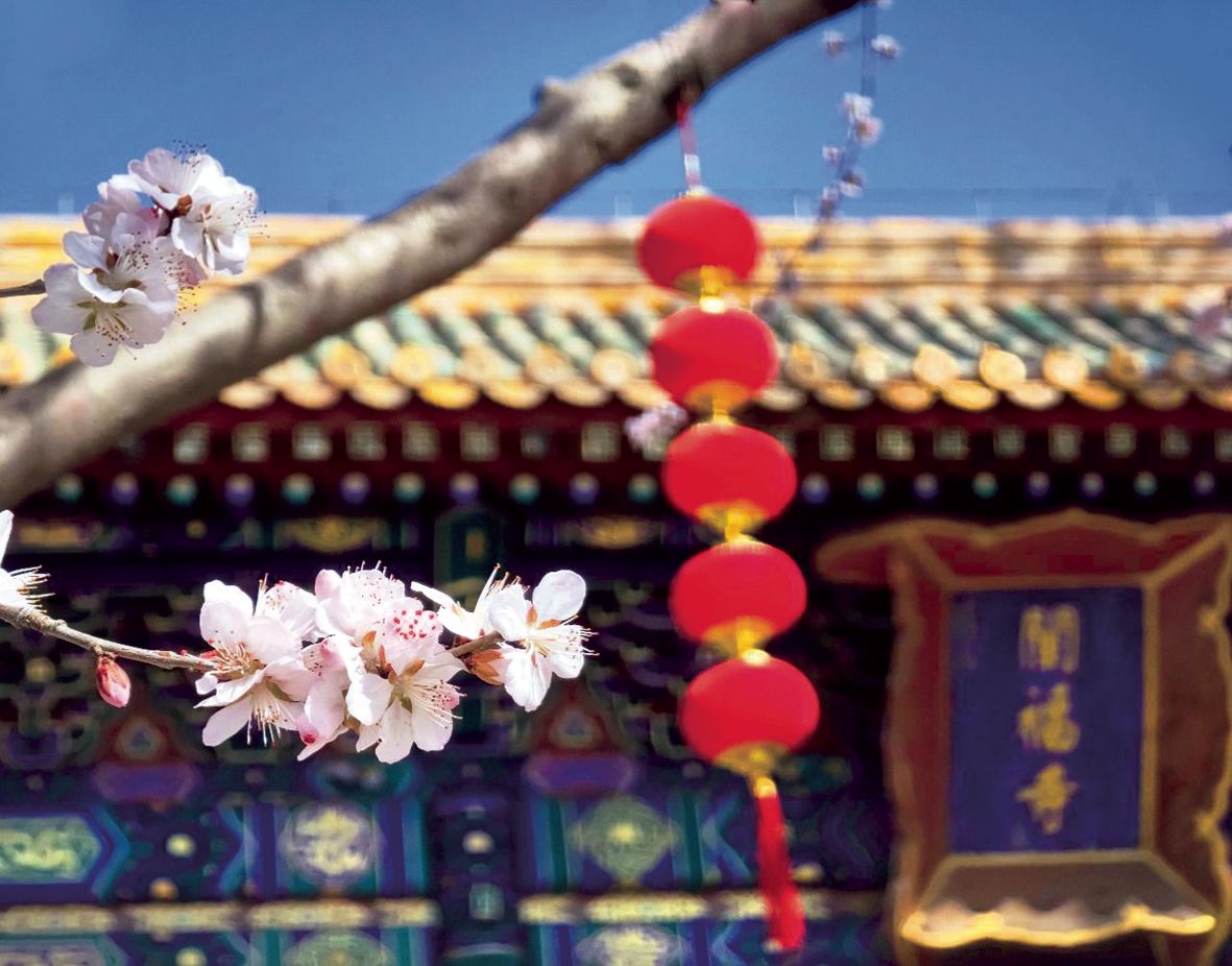 出九之日,游船开航,澄湖之上,画船摇荡。沉寂一冬的太液池碧波中,果然有了新的映象。而阐福寺门前原本空落落的枝头,簇簇桃红摇曳晴蓝,或跃上飞檐碧瓦,或与彩绘雕梁同框,或锦簇青天,灿若云霞。
