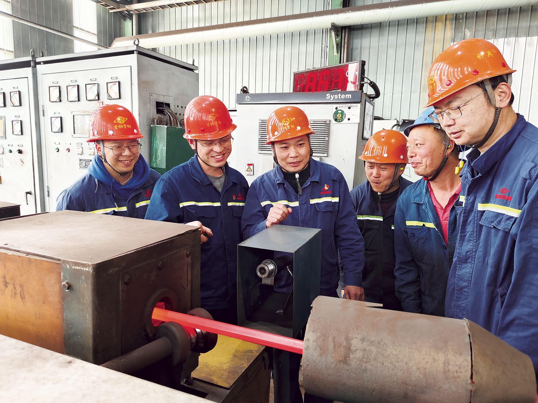 李永富创新工作室紧紧围绕生产难题,开展技术攻关。针对钎钢正火工艺存在加热温度波动,导致质量不稳、效率低、能耗高的问题,与重庆专业厂联合研制双工位自动上下料正火生产线,加热温度波动控制在±20℃以内,产品凿岩寿命提升30%,吨钢电耗降低13.16%,生产效率提高3.1倍,年增效90余万元,累计形成国家实用新型专利2项。