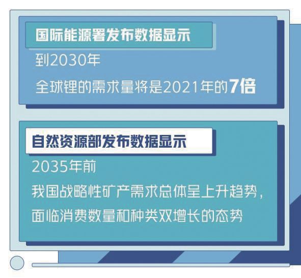 目前,全球各主要国家纷纷提升国内矿产资源尤其是战略性矿产资源保障能力,以确保能源矿产安全。国际能源署此前发布的数据显示,到2030年,全球锂的需求量将是2021年的7倍。自然资源部发布的数据也显示,2035年前,我国战略性矿产需求总体呈上升趋势,将面临消费数量和种类双增长的态势。