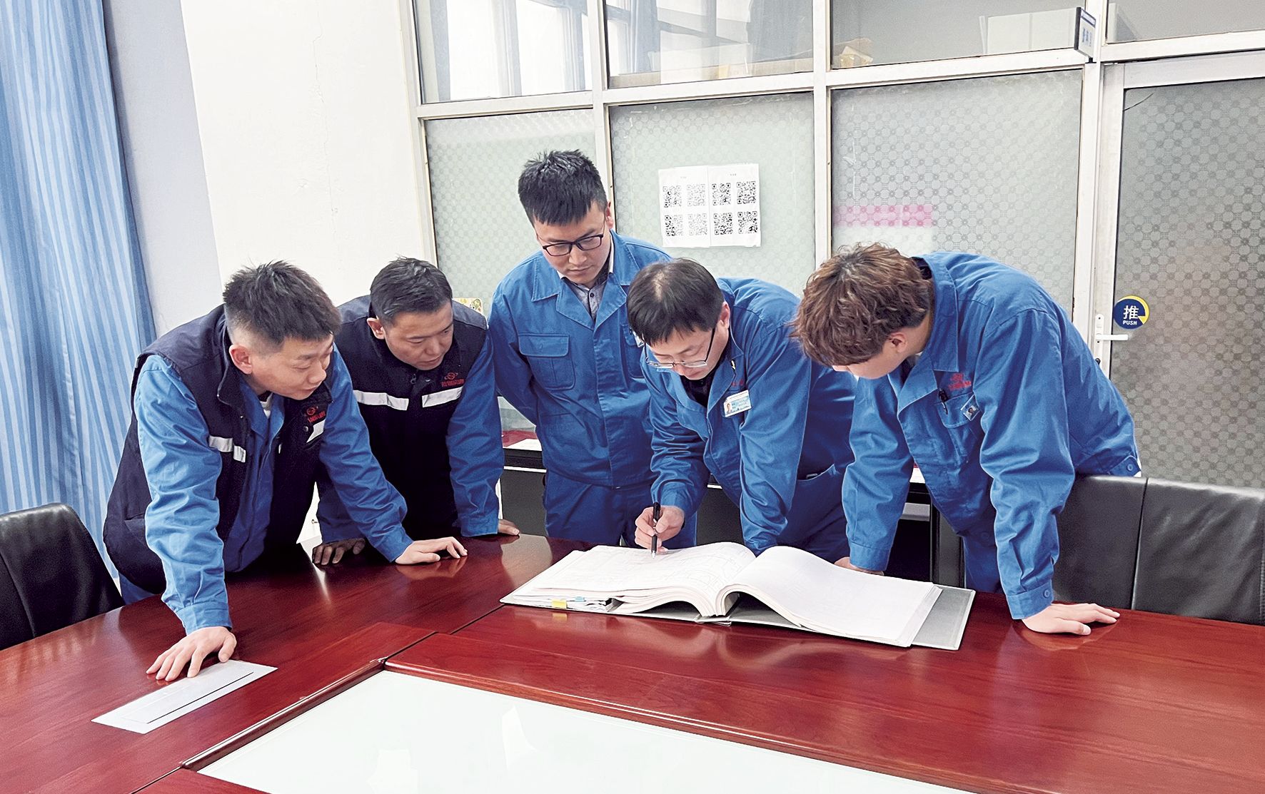 王文斌(右二)为干熄焦排出设备寿命延长课题成员开拓创新思路。 |
