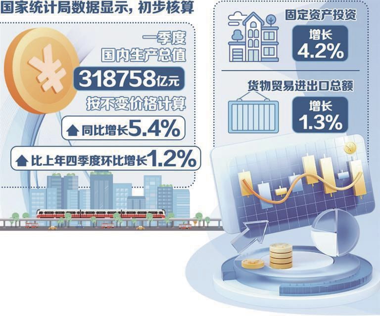 2025年中国经济“首季报”发布。国家统计局数据显示,初步核算,一季度国内生产总值318758亿元,按不变价格计算,同比增长5.4%,比上年四季度环比增长1.2%。