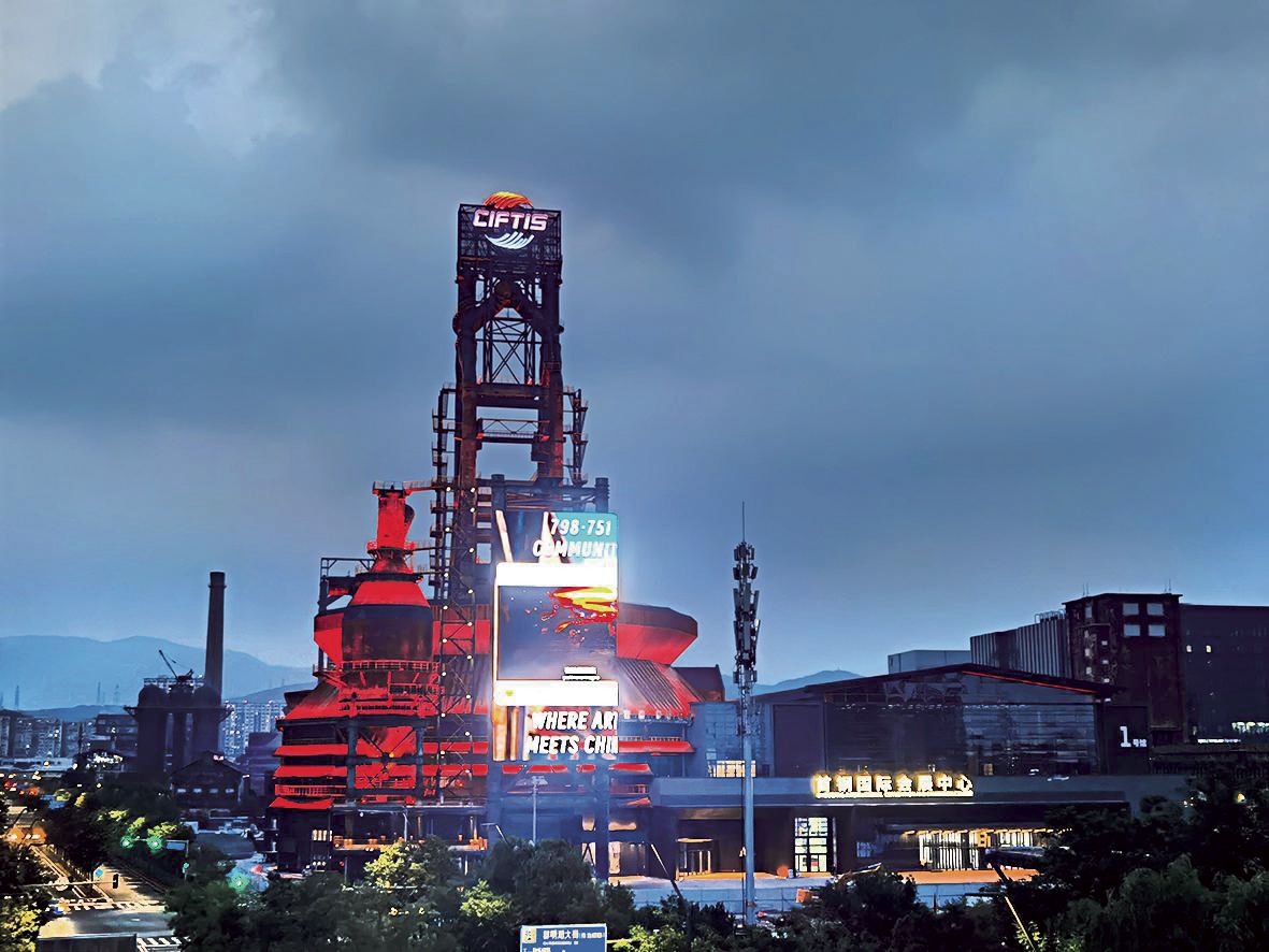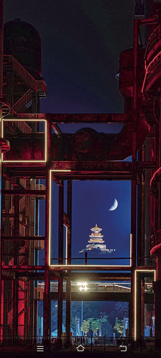 抬眼望去,三高炉身披炽烈如熔岩的赤红光影,磅礴气势直抵苍穹;一高炉门前,“大圣”雕塑在光影魔法下幻彩熠熠,仿佛下一秒就要腾云驾雾;而四高炉之巅,“CIFTIS”(服贸会)的巨型标识如桂冠般璀璨夺目,宣示着这片热土崭新的国际舞台身份……这些钢铁巨人,正以最绚丽的方式讲述着蜕变与新生的故事。