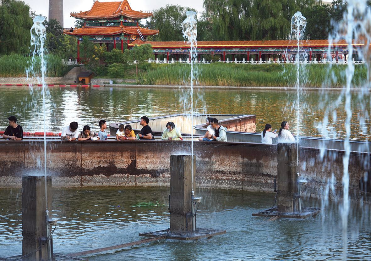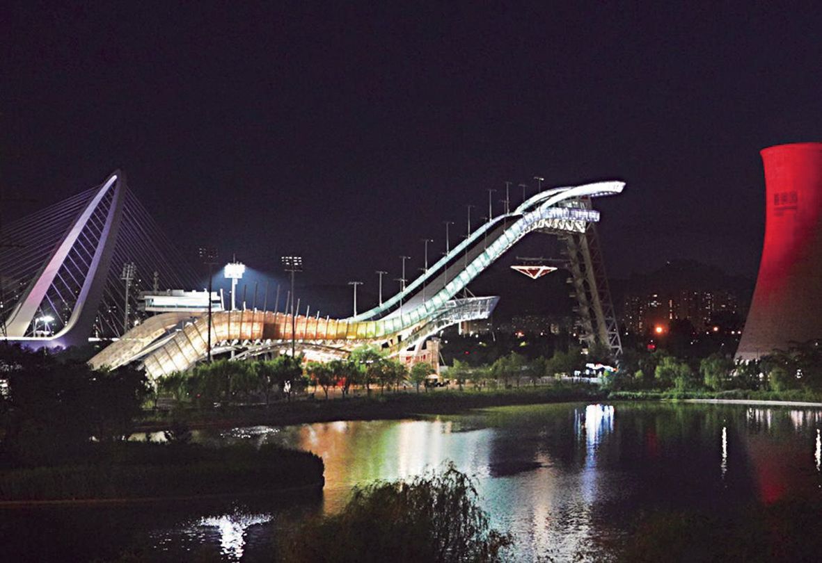 若想寻觅一份宁静,群明湖北侧的木栈道便是绝佳去处。这里俨然成了市民消夏遛弯的“后花园”。由工业遗存精心改造的喷泉群,在夜色中吐纳着清凉的水雾,水珠跳跃,光影迷离,为燥热的夏夜平添几许灵动与惬意。漫步于下沉式栈道,两侧是水波、灯光与工业遗迹交织的流动画卷,恍惚间,竟不知是“人在画中游”,还是这绝妙景致正随你的脚步徐徐铺展。当黑夜完全降临,皮划艇与游船悄然归港,湖面宛如巨大的墨色镜台。此刻,流光溢彩的首钢滑雪大跳台——“水晶鞋”的倒影清晰浮现,与满天星斗一同坠入这宁静的湖心,构筑出独属于首钢园的、刚柔并济的梦幻夜景。
