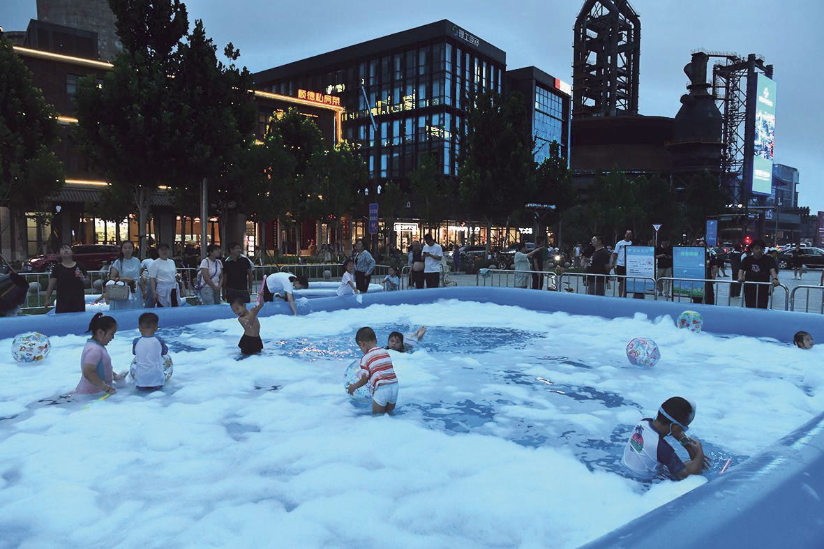 运动的激情与味蕾的欢愉,在首钢园从来只有“一步之遥”。转身步入六工汇,工业风的硬朗线条瞬间被烟火气与笑语填满。露天食肆香气四溢,烤串滋滋作响,冰镇啤酒在杯中荡漾着琥珀色的光。大人们举杯畅谈,杯壁上倒映着不远处浪花乐园里孩子们追逐嬉戏、掀起的晶莹泡沫。这杯里,盛满了轻松惬意的夏夜滋味,也映照着最简单纯粹的亲子时光。