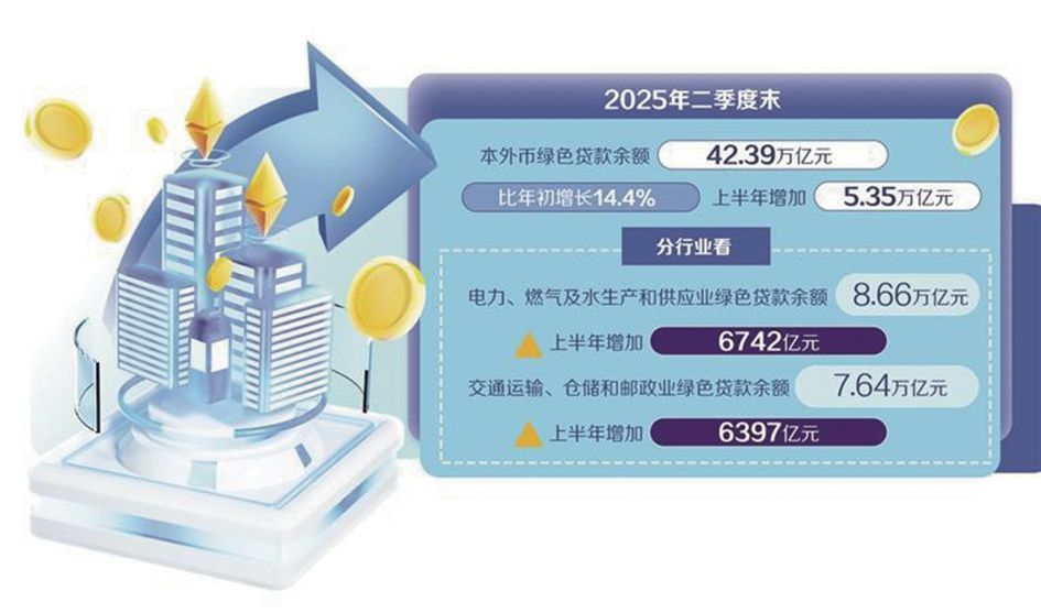数据显示,2025年二季度末,本外币绿色贷款余额42.39万亿元,比年初增长14.4%,上半年增加5.35万亿元。分行业看,电力、燃气及水生产和供应业绿色贷款余额8.66万亿元,上半年增加6742亿元;交通运输、仓储和邮政业绿色贷款余额7.64万亿元,上半年增加6397亿元。
