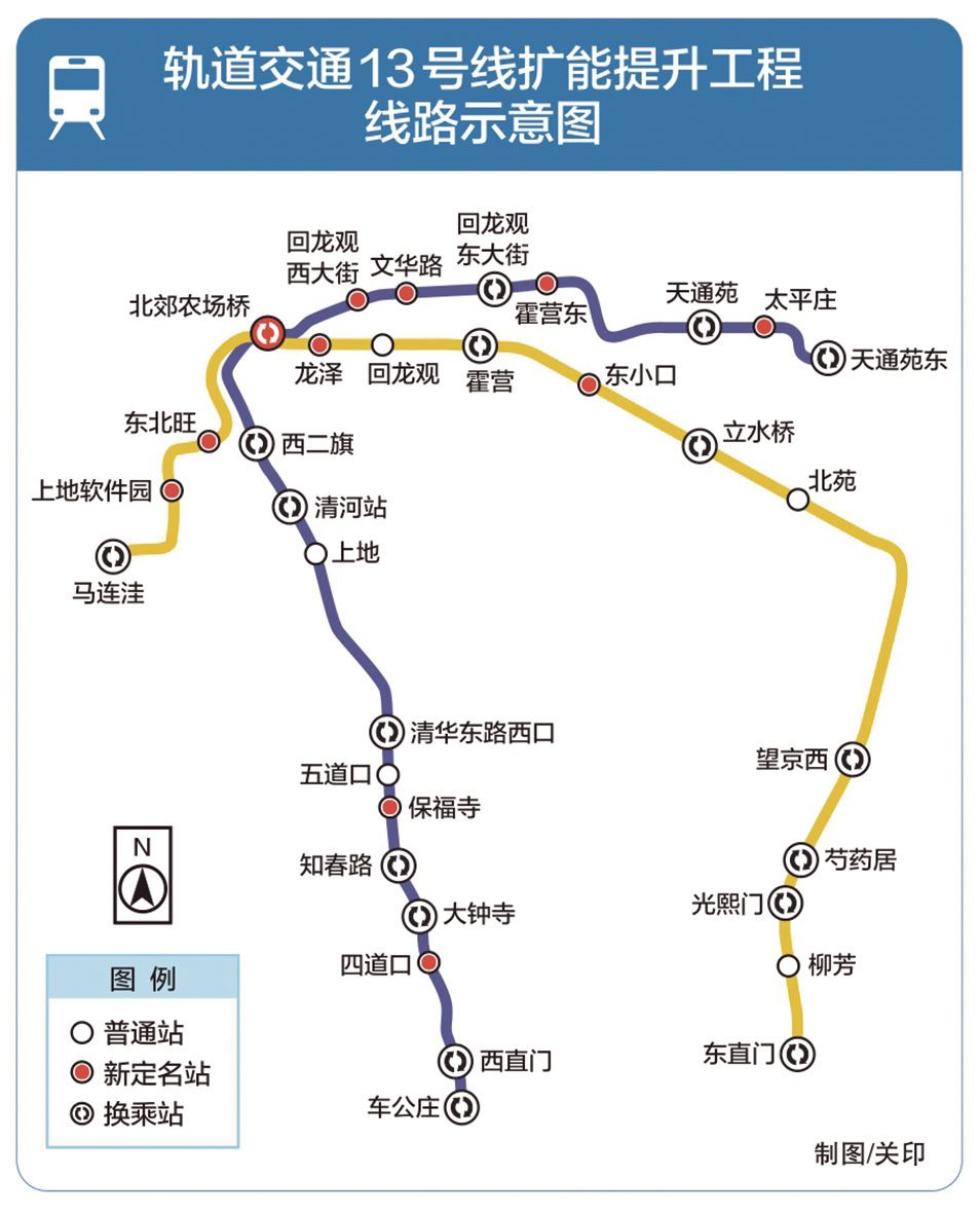 13号线扩能提升工程途经西城、海淀、昌平、朝阳和东城五区,是国内首条大型“新建+改造”地铁工程,也是国内最大规模既有线改造工程。根据建设方案,工程将既有地铁13号线“倒U形”线路进行拆分扩能,在16号线和17号线之间形成两条“L形”线路。