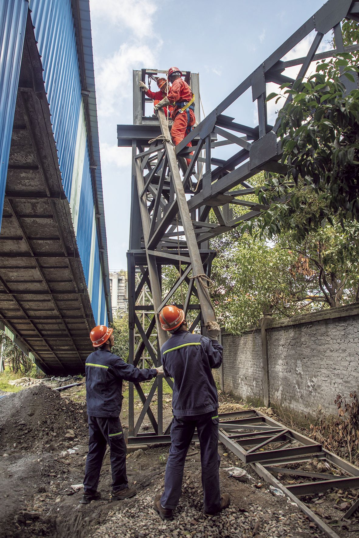 “抓紧,等我们固定绳索!”在08变电站旁的皮带通廊与围墙之间的狭窄空间里,供水作业区综合班的邓广文、张金茂等4名职工正协力用绳索将一段制作好的电缆架缓缓吊升至离地约3米高的位置,并加装斜角托架,防止电缆敷设后出现悬空。