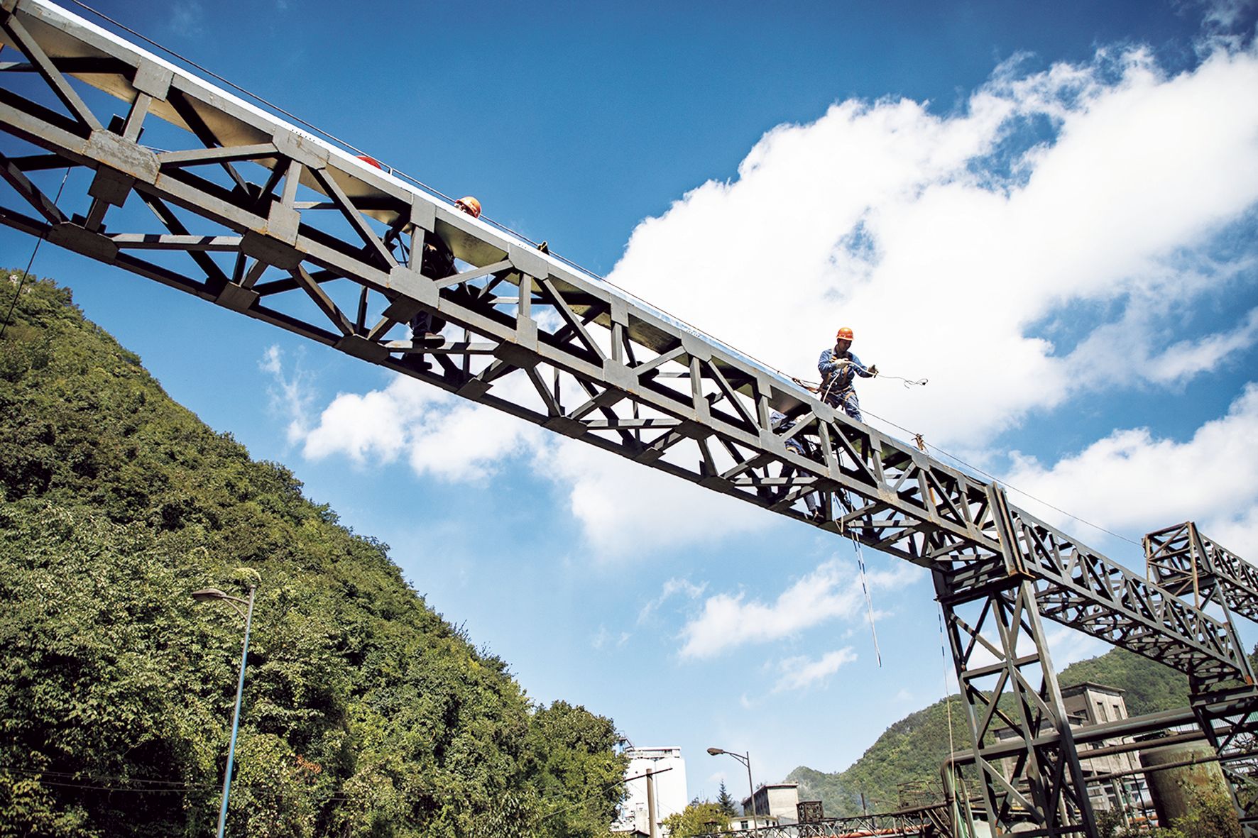 不远处,供电作业区的职工也在高空作业。他们借助绳索,将电缆托板和工具逐一吊送至电缆架上。再有两天电缆架就会全部安装完成,他们必须趁天气好的时候尽快装完托板,才能早日敷设电缆,消除隐患。