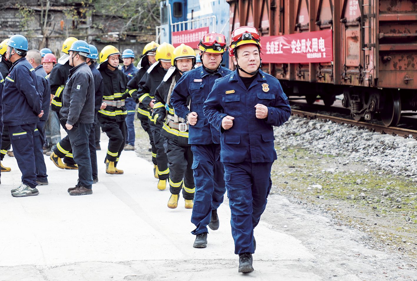 演练以“模拟机车动力室起火应急处置”为主线,完整还原从火情发现、信息上报、初起扑救到专业救援的全过程。10时,演练在GK1c-139机车鸣笛声中启动。模拟场景中,该机车在料场牵引车辆时,司机发现动力室高温报警并伴有浓烟,立即停车并指派副司机检查。确认火情后,副司机迅速使用车载灭火器扑救初起火灾,司机则同步报警并联系运输站调度,请求分离尾部车列。调度员迅速安排003机车,将尾部车辆牵引至安全距离,有效阻断了风险扩散路径。与此同时,现场人员严格按照应急流程逐级上报信息,实现“零延迟”传递。该事业部也随即启动综合救援预案,各专业负责人迅速赶赴现场协同处置。首钢水钢消防大队接到报警后,两辆消防车迅速抵达。根据机车起火点及油箱位置,救援队伍制定作战方案:1号车利用水炮高空覆盖灭火,2号车对油箱进行降温,火势很快得到控制并被彻底扑灭。