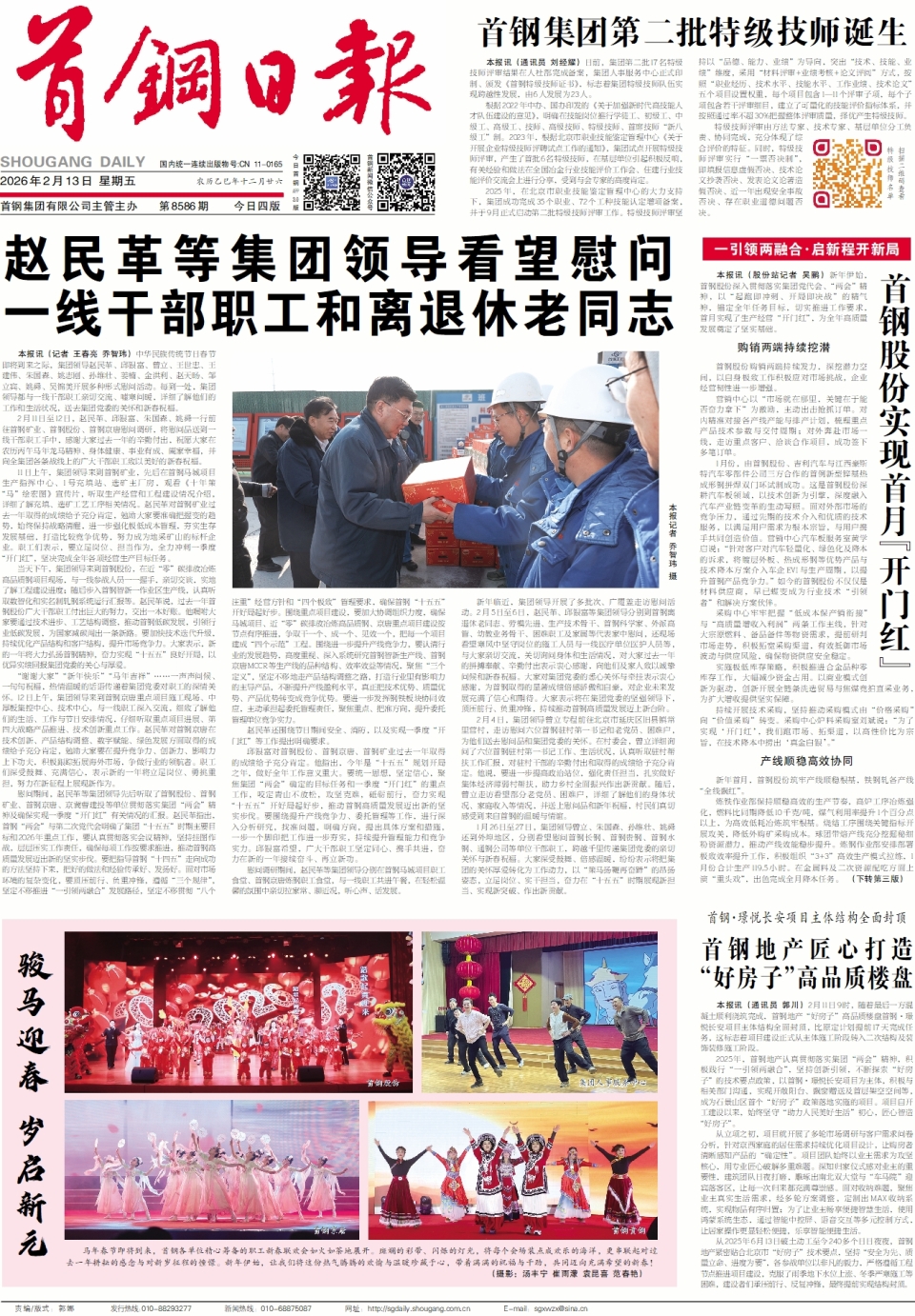 2月11日至12日,赵民革、邱银富、朱国森、姚舜一行前往首钢矿业、首钢股份、首钢京唐慰问调研,将慰问品送到一线干部职工手中,感谢大家过去一年的辛勤付出,祝愿大家在农历丙午马年龙马精神、身体健康、事业有成、阖家幸福,并向全集团各条战线上的广大干部职工致以美好的新春祝福。
