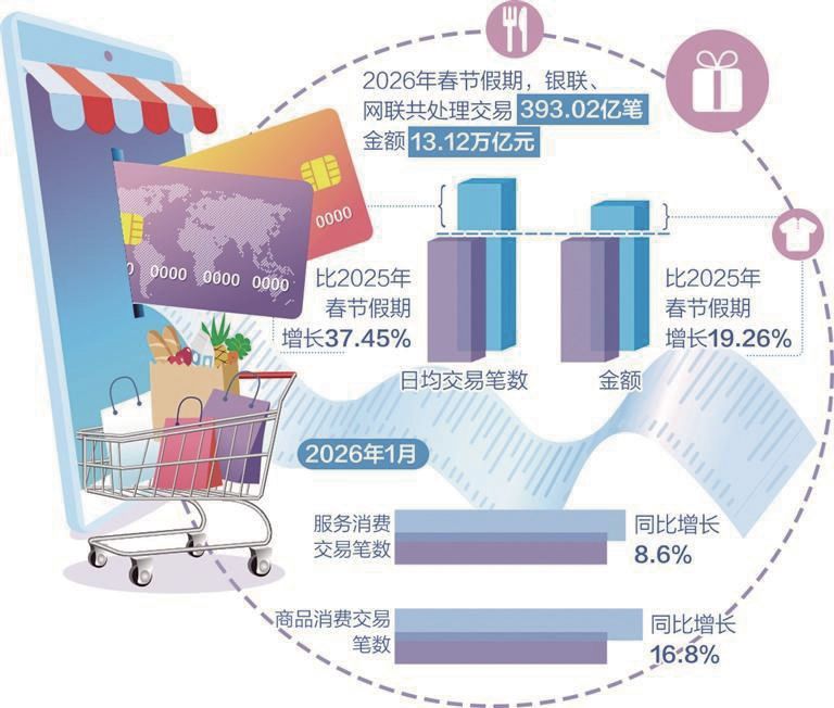 2月24日,中国人民银行公布的数据显示,2026年春节假期(2026年2月15日至2月23日),银联、网联共处理交易393.02亿笔,金额13.12万亿元,日均交易笔数和金额分别较2025年春节假期(2025年1月28日至2月4日)增长37.45%和19.26%。从银联、网联的交易数据看,移动支付消费增势较好。